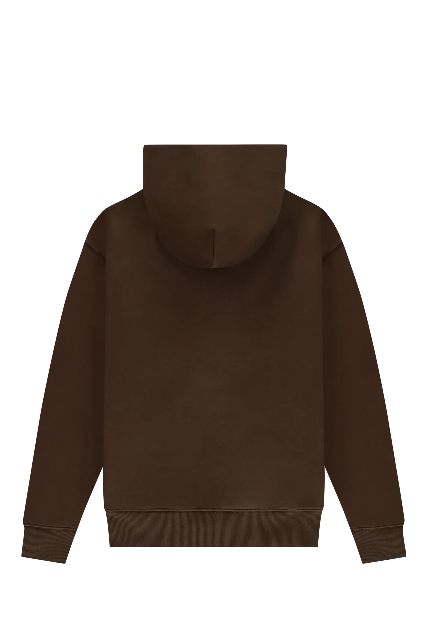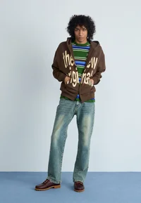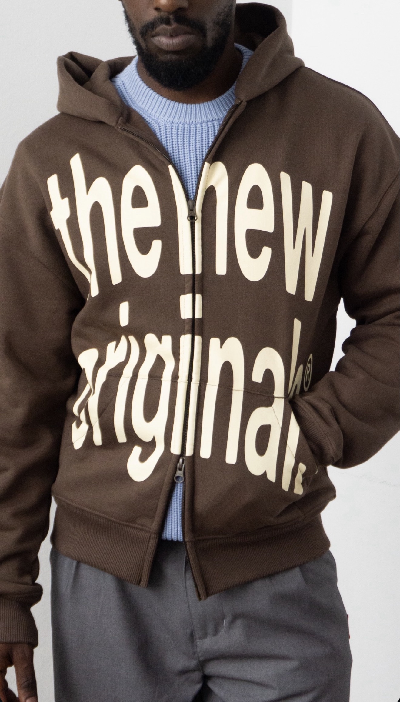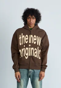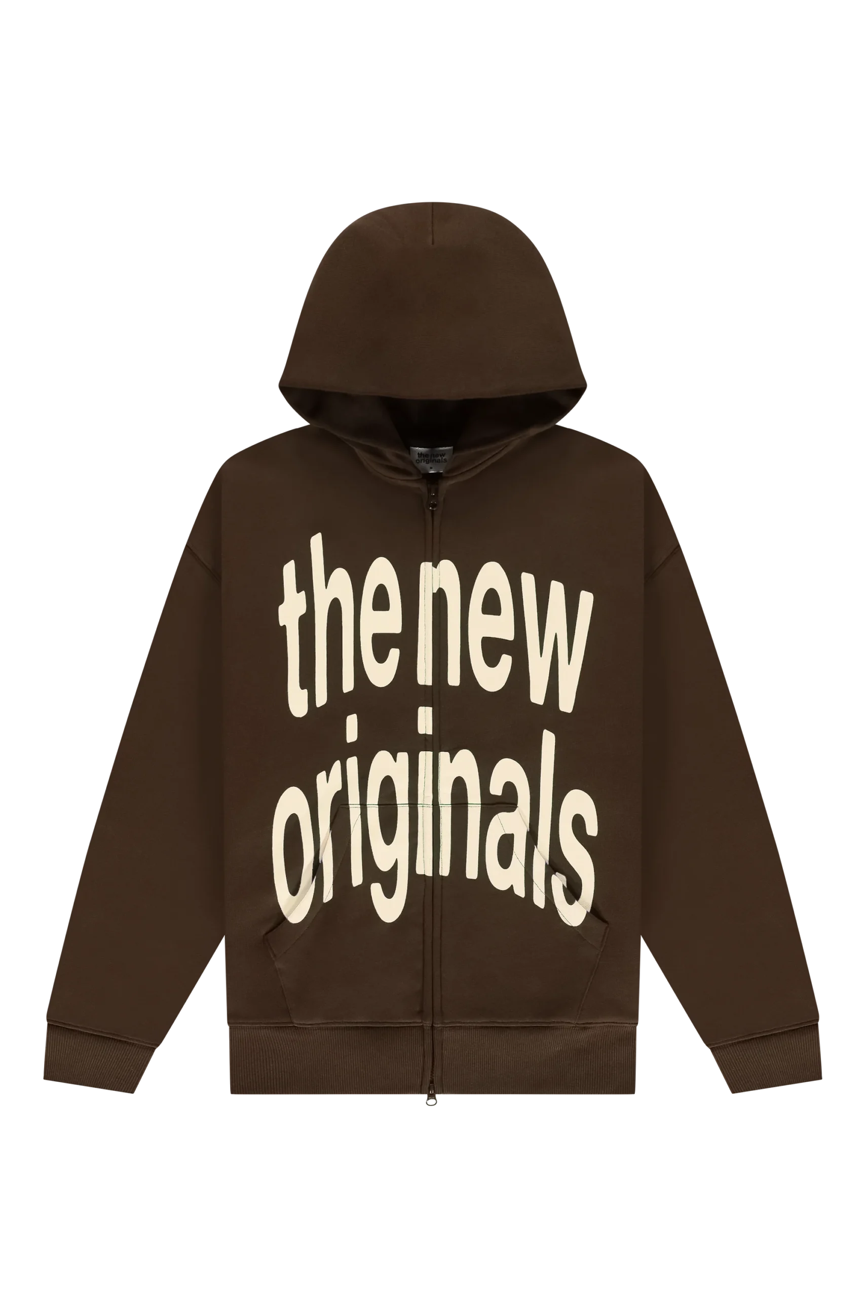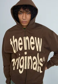 the big logo zip up hoodie in acid brown. crafted from heavyweight cotton, this full-zip hoodie features an oversized the new originals logo stretched across the front.