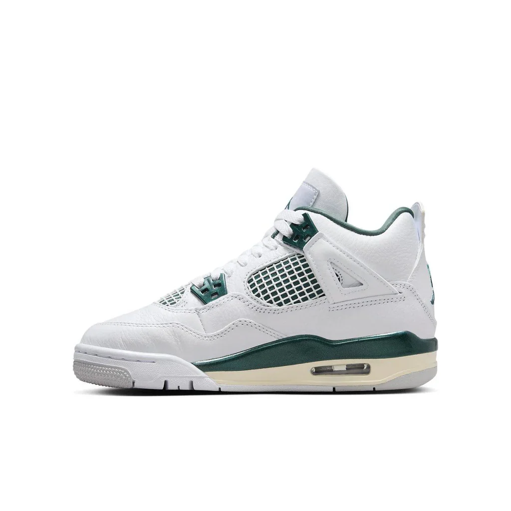 Progettata per ragazzi, l’Air Jordan 4 Retro GS ‘Oxidized Green’ presenta una tomaia in pelle bianca impeccabile, completa di ali di supporto e linguetta sul tallone. Quest’ultima è contrassegnata da un logo Jumpman verde scuro, che si abbina alla fodera del colletto della scarpa, al pannello laterale in rete e agli occhielli in TPU. Ulteriore branding Jumpman adorna l’etichetta tessuta sulla linguetta e la soletta interna. Questa silhouette iconica è montata su un’intersuola in poliuretano bicolore, dotata di un’unità Air-sole visibile nel tallone e supportata da una suola in gomma grigio chiaro, garantendo sia stile che prestazioni.